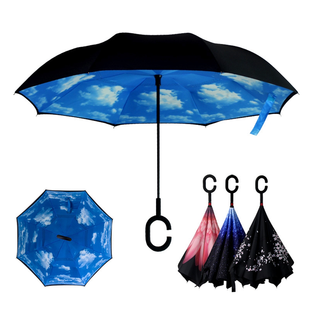 Made of double layer pongee umbrella cloth, 8 fiber bones and carbon fiber stick and automatic push-button open. C-type frosted handle can release one of your hands and it is convenient for you to do other important things. Unique Double Layer and Reverse Opening and Folding design, fold the top "wet" layer into the under "dry" layer when you step into your car or store or wherever, which prevents water from dripping, keeping floors and cars dry. This car reverse umbrella is perfect for your car.