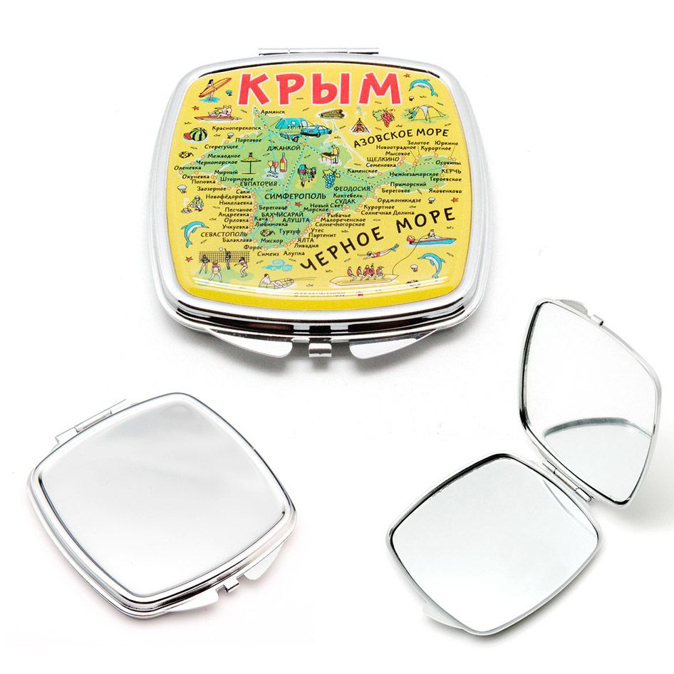 Foldable cosmetic mirror. Pocket size. double mirrors inside, easy opening, Non-slip bottom design. Chrome plated metal surface. Your design can be epoxy imprinted on the upside of lid.