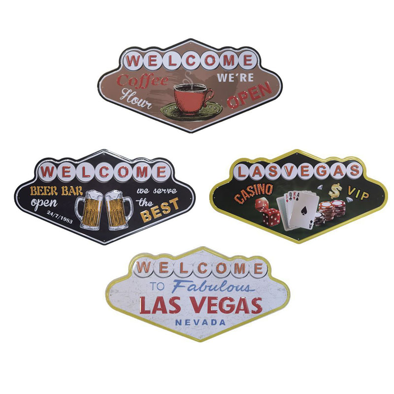 Retro vintage tin signs add nostalgic fun to home, garage, man cave, mechanics, auto services, bar, lounge, patio, cabin, basement, den, game/entertainment room, office or virtually any space.High quality print that will stand the test of time. Made of high-quality tinplate. Pre-drilled holes that you can be nailed or taped to the wall, or hang up with hemp cord or metal wire. We have many different shape for your choosing. Wecome your full color logo art printd on it !