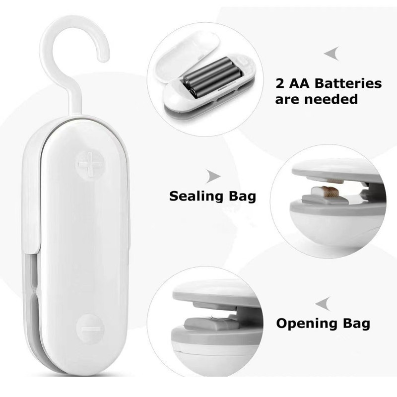 The mini sealer can be used at home to store food properly. this mini bag sealer fits in your pocket and is perfect for traveling and carrying. one end of the sealer seals the bag, the other end cuts the bag. Needs 2 X AA batteries (not included). When the battery power is insufficient, the sealing effect will be affected, you should replace the battery. Please remove the battery if it is not used for a long time.