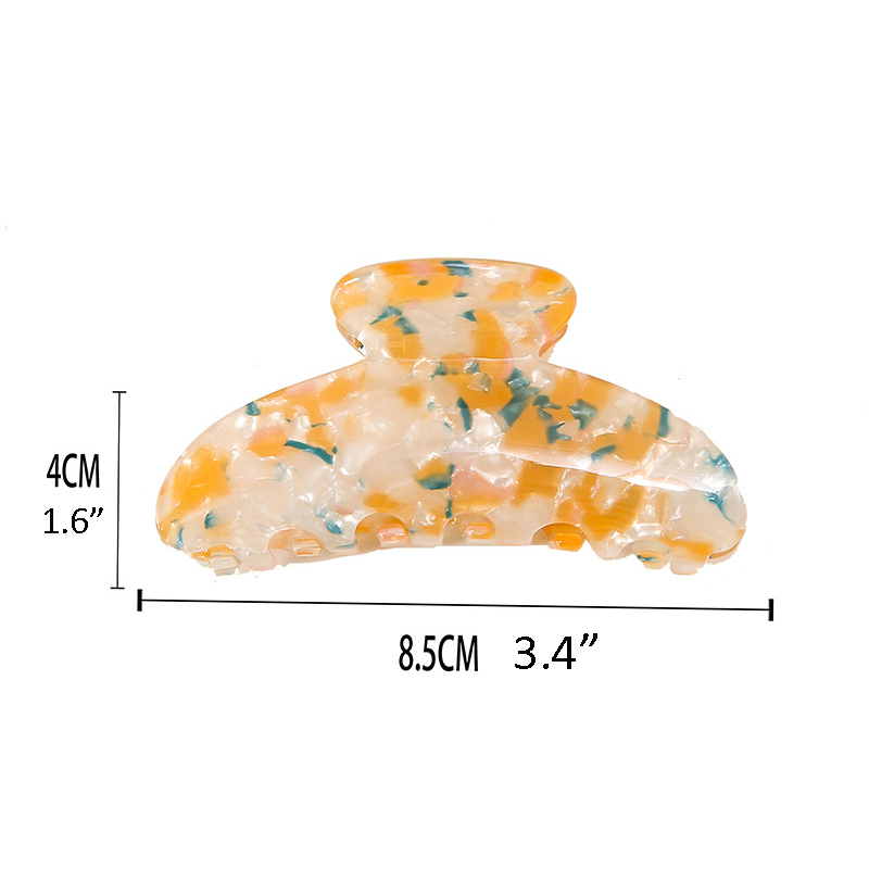 Made of Acrylic. It is fashion and cute. The clips have a diameter of 8.5 cm and can hold hair tightly.
