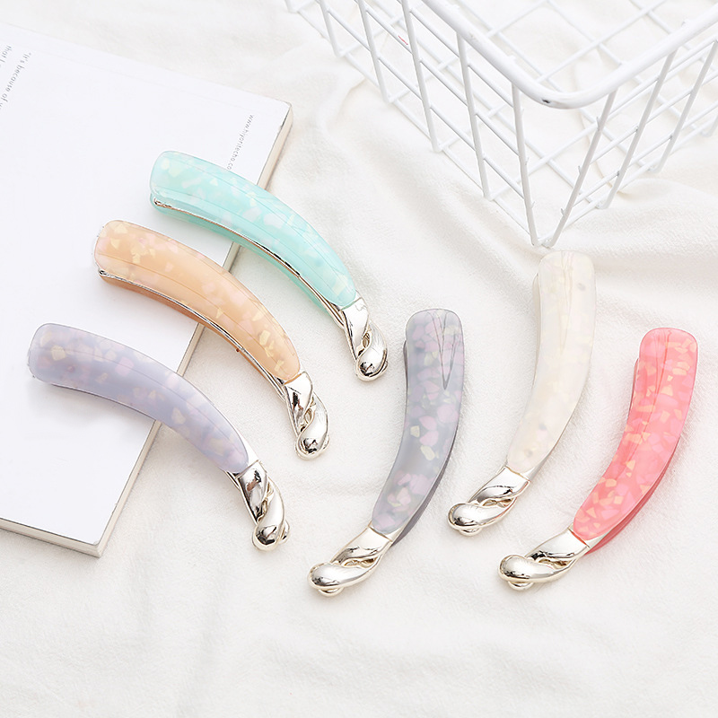 Made of Acrylic. It is fashion and Clasic. The clips have a diameter of 10.5 cm and can hold hair tightly.