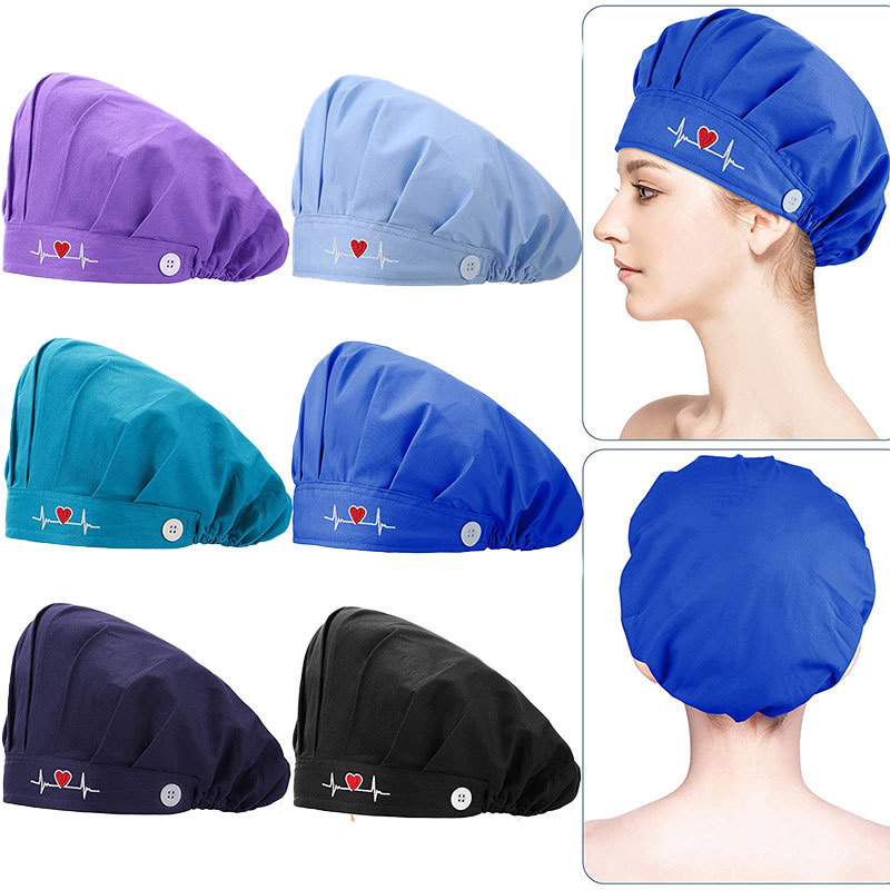This working cap is designed to cover your hair comfortably without causing discomfort. It is made from high-quality cotton fabric, ensuring it is lightweight, breathable, and quick-drying. It has buttons on each side to alleviate the pressure from mask straps on the ears. Additionally, there is a sweatband on the forehead to secure the cap and absorb sweat. It is an excellent choice for hospitals, clinics, health fairs, nursing schools, beauty salons, and many other settings.