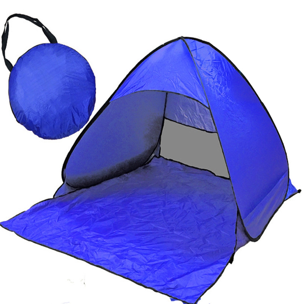 This Automatic Pop-Up Instant Cabana Tent easily pops up in a seconds and folds up into a compact carrying bag, so it can go wherever you do. Save time and space. The special silver-coated fabric provides UV protection. Bigger size and zipped up tent available as well. 6 stakes included.