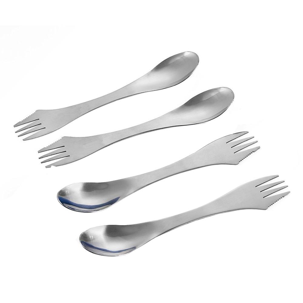 These Sporks is a complete 3-in-1 utensil with a full-sized spoon and fork plus a serrated edge to serve as a knife. This camping spork can be used as fork, spoon and knife. Very suitable for outdoor activities like camping, fishing, hiking. One item, three functions.