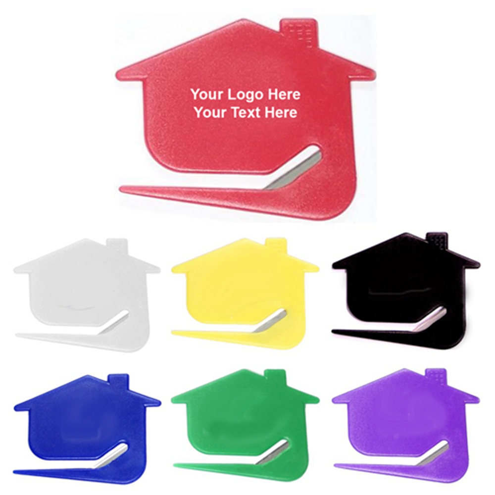 This house-shaped and user-friendly letter opener is made of ABS and features a safety blade concealed in a safe plastic case. Useful for promotional gifts, trade shows, post offices, mail delivery providers, and home or office