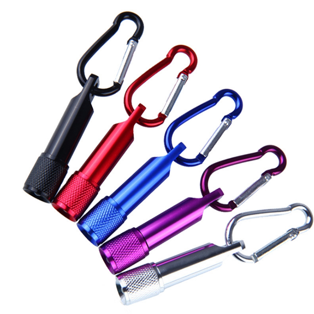 LED Flashlight with Carabiner. Made of High-Quality Aluminum Alloy Material With Super Bright High Power LED, it makes the mini LED flashlight lighttweight. Total length is 4", with three button cell batteries inserted. So It Has the Advantages of Small Occupied Space. Really Easy to Carry Around.Your LOGO can be laser engraved