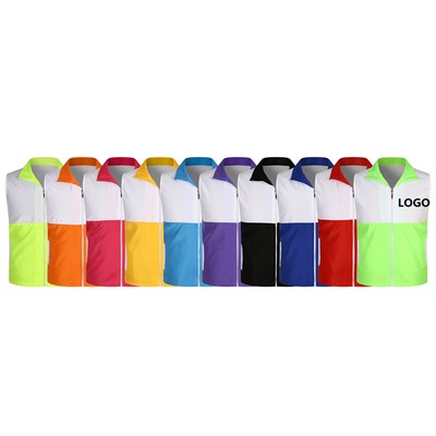 It is made of polyester. The vest features two side pockets and full zipper closure.